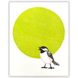 This four color print on lush, 100% cotton paper was created from one wood block for the background, and a three color reduction cut linoleum blocks for the bird. Reduction cuts are made by carving into the same piece of linoleum, thereby destroying the block as it is printed. That means there is no going back and reprinting the image!