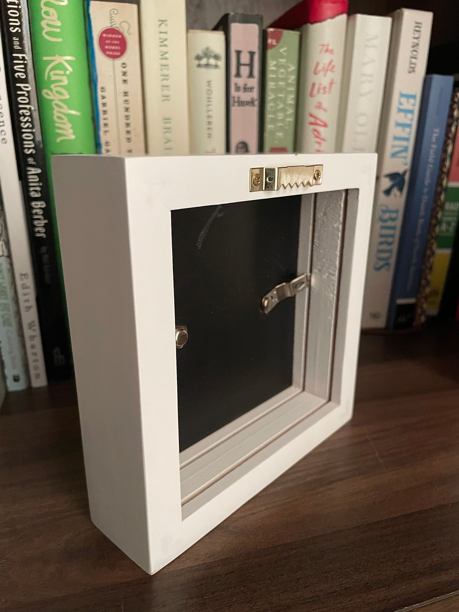 Heavy duty white frames are 1.5" thick, and can stand on their own, or use the sawtooth hook on the back to hang on the wall.